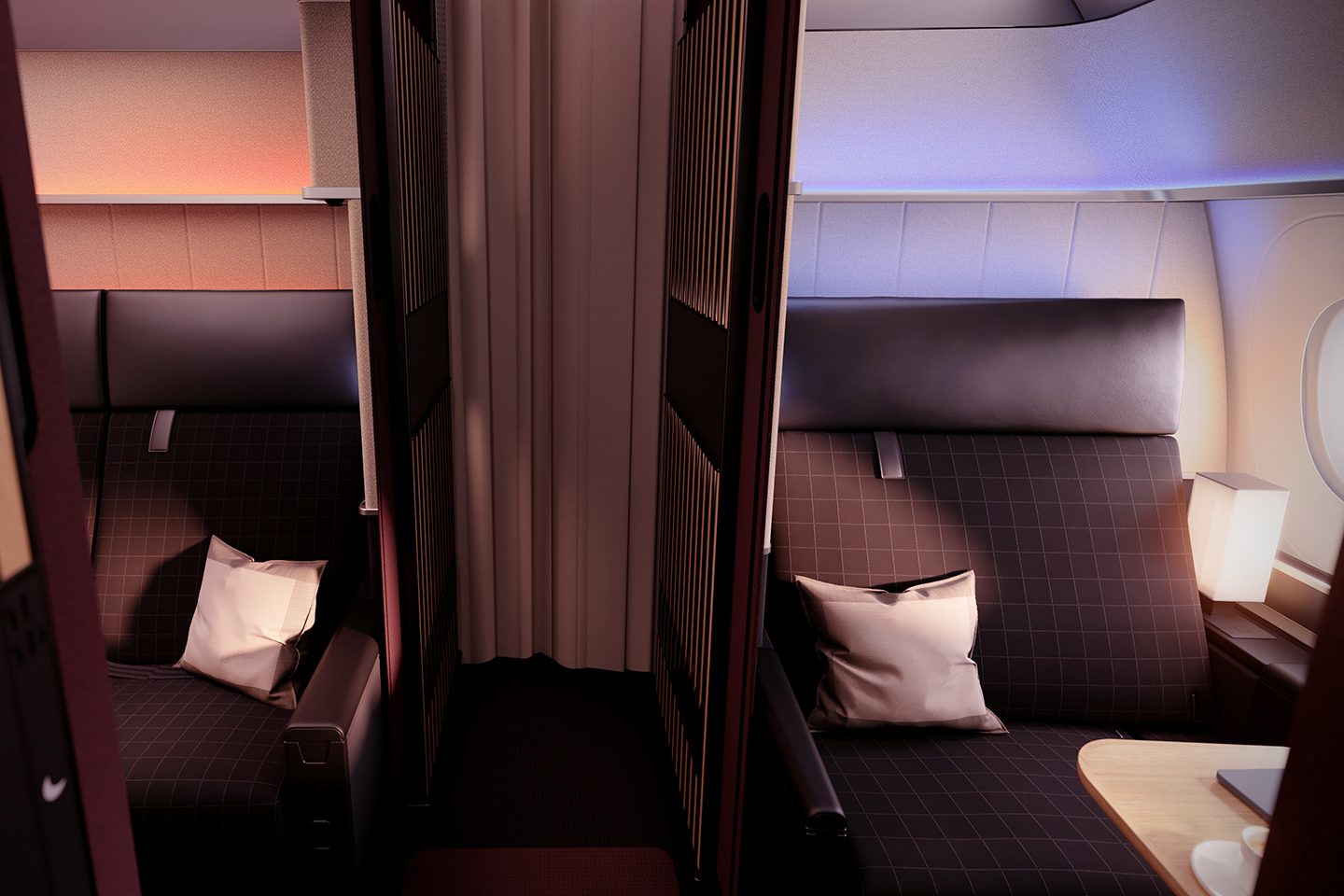 SWISS First Grand Suite allows the Single Suite by the window to be connected to the centrally located Suite Plus by a private aisle, creating a spacious, secluded loft to provide additional room for couples traveling together, families or business travelers. The combined private area, which also features over 1.8-meter-high walls, can be used as a workplace, a restaurant or a bedroom. This extensive space enables travelers to spend their flight free and undisturbed within their own exclusive zone.